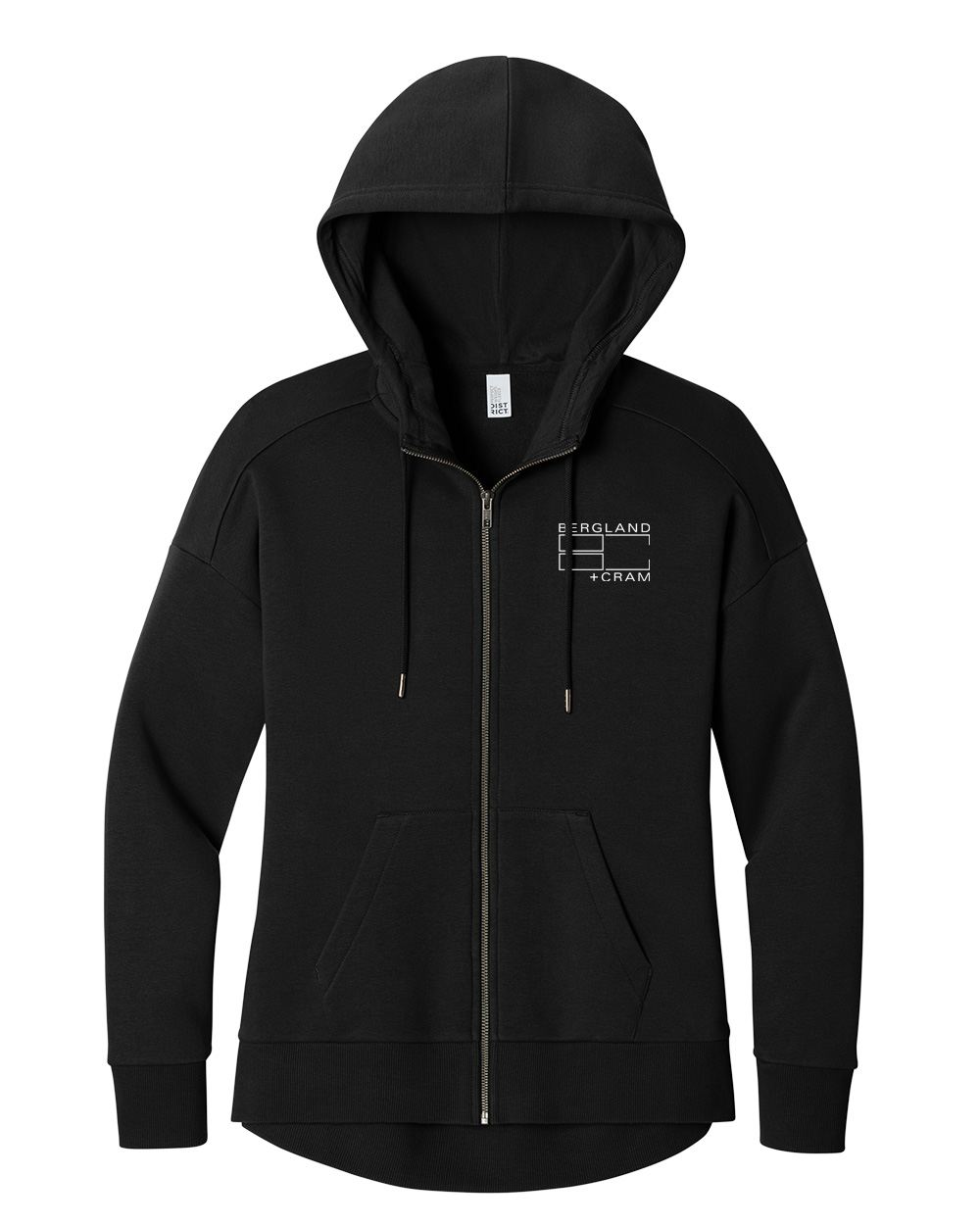 District perfect weight fleece drop shoulder full-zip hoodie printed with the B+C logo. Available in women's adult sizes.
