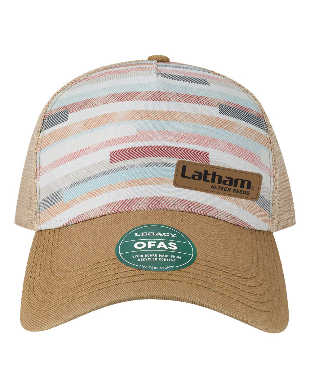 Legacy Old Favorite five-panel trucker cap with a Latham decorated with a Latham Seeds patch.