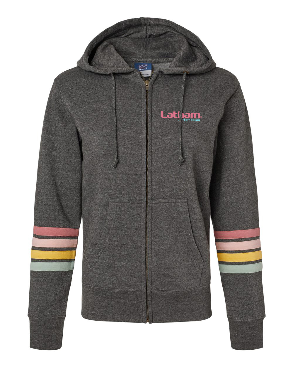 MV Sport striped sleeves full-zip hooded sweatshirt embroidered with the Latham Seeds logo. Available in women's adult sizes.