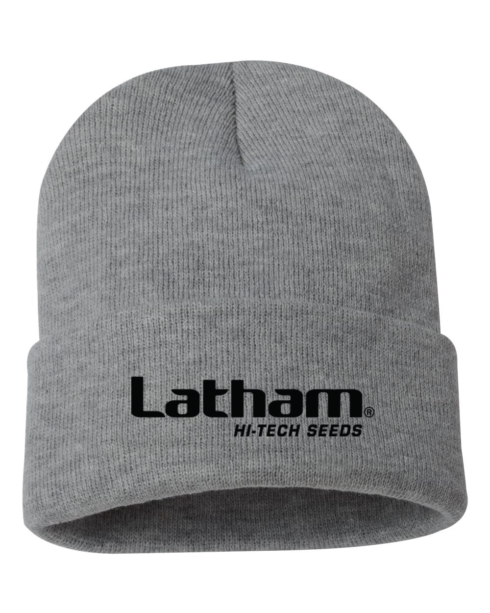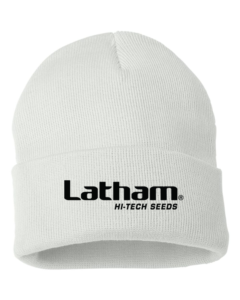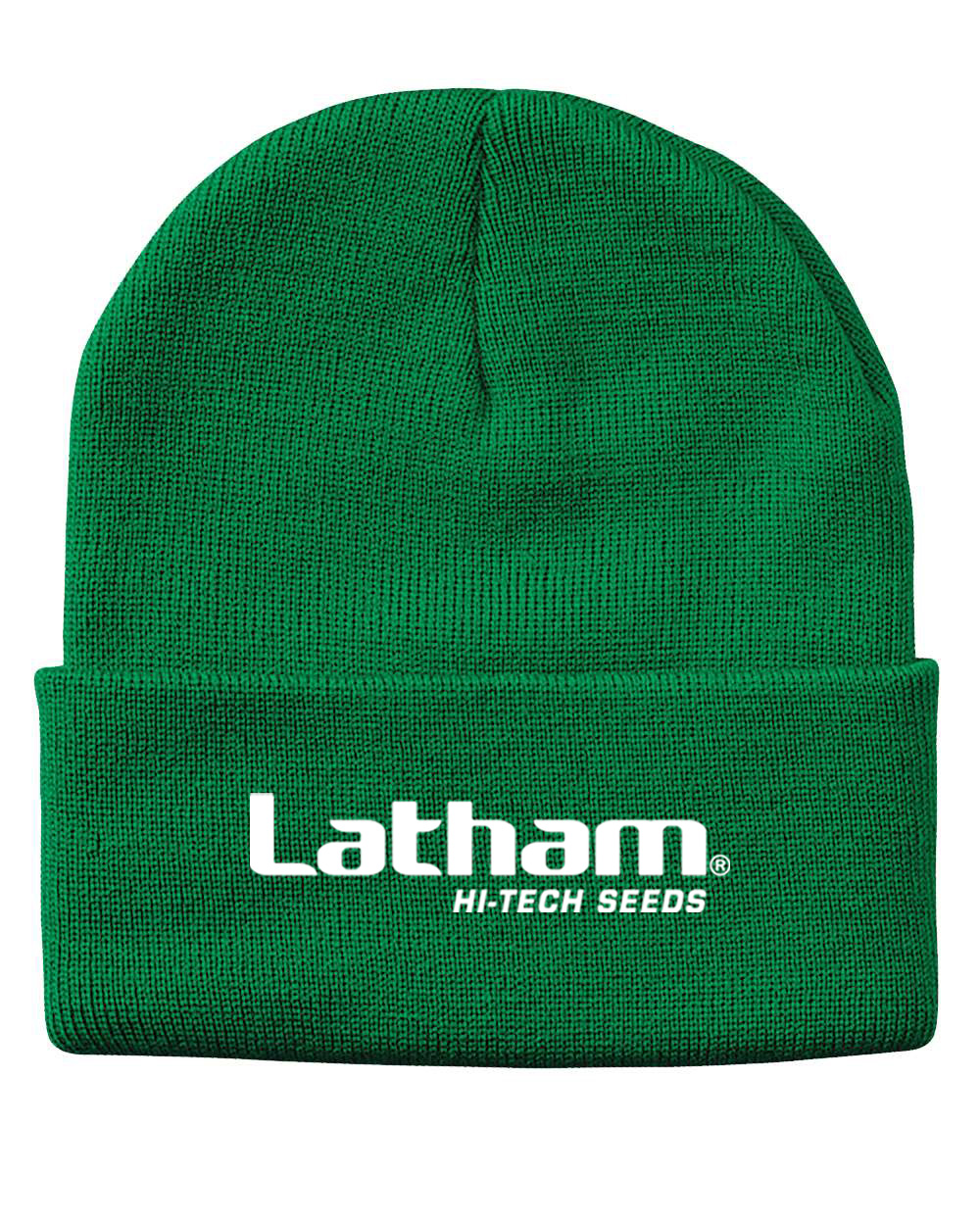 Product Description Sportsman cuff beanie embroidered with the Latham Seeds Logo. 80/20 acrylic knit/ polyester fleece Exterior 100% acrylic & interior 100% polyester 12" knit Adjustable cuff, shown as 3"
