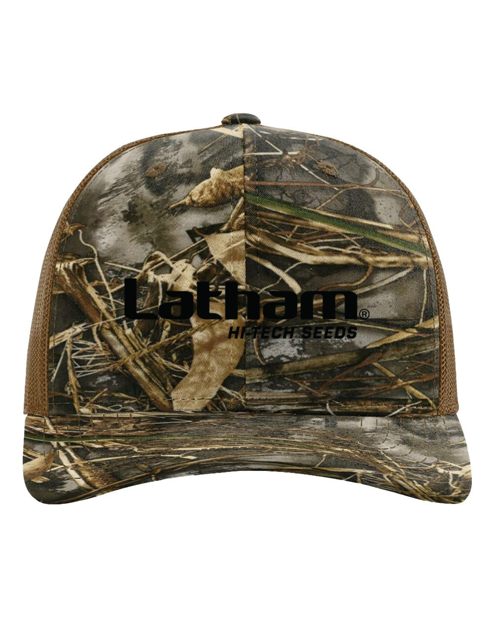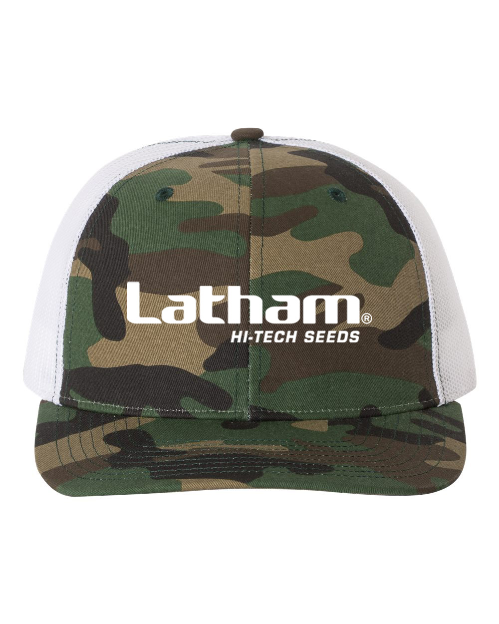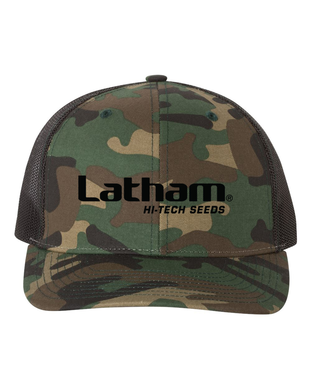 Richardson printed trucker cap embroidered with the Latham Seeds logo.
